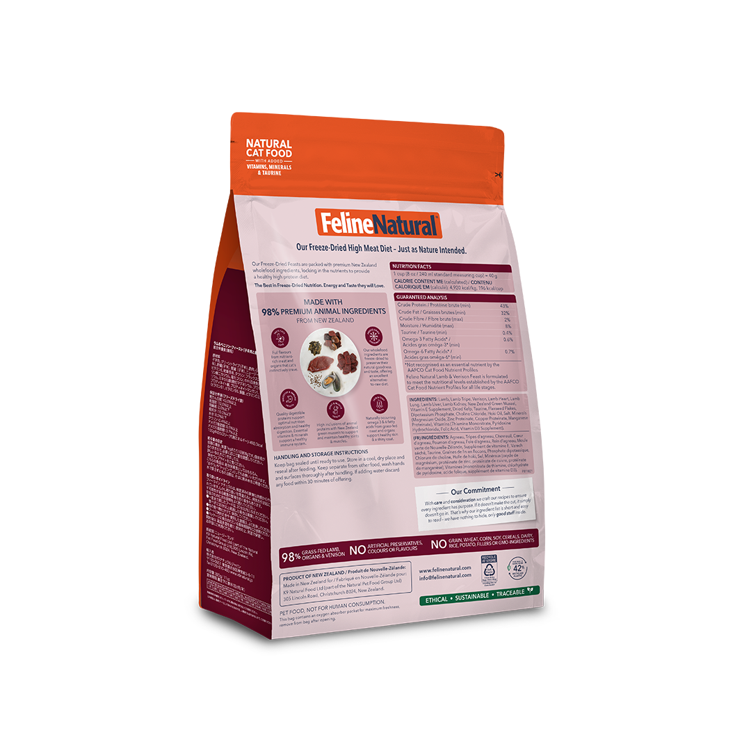 Our complete and balanced Freeze-Dried New Zealand Lamb & Venison Feast contains 98% Grass-fed & Grass-finished Lamb, Venison & Organs, with New Zealand Green Mussels, Flaxseed Flakes, Oils, Kelp, Vitamins, Minerals and Taurine in support of your cat's whole-body health.