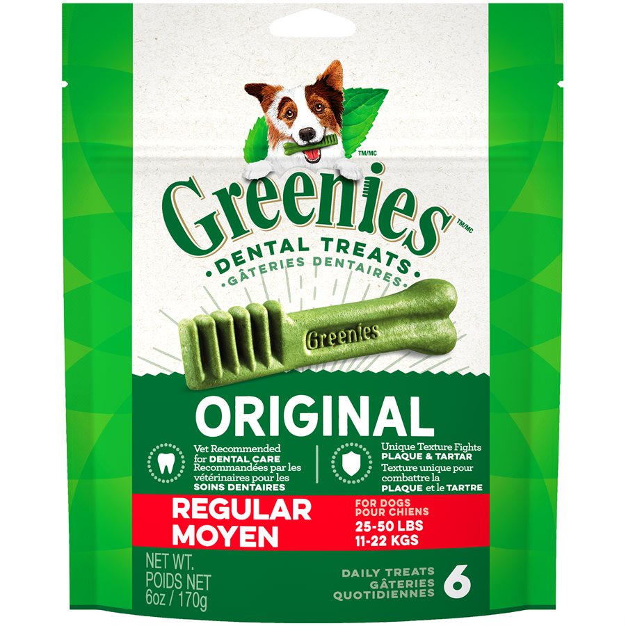 Complete oral care is important for your dog’s total body health and GREENIES®Canine Dental Chews are proven to clean dogs’ teeth by fighting both plaque and tartar buildup, freshening breath, and maintaining healthier teeth and gums.