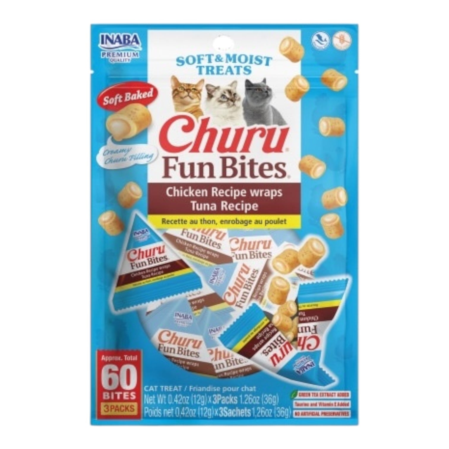 TWICE THE TEXTURE: Each pillow-shaped bite starts with a soft baked chicken paste with no grains, preservatives, carrageenan or artificial colors. Then we've filled the centers with Inaba's delicious Churu filling to give your cat twice the texture