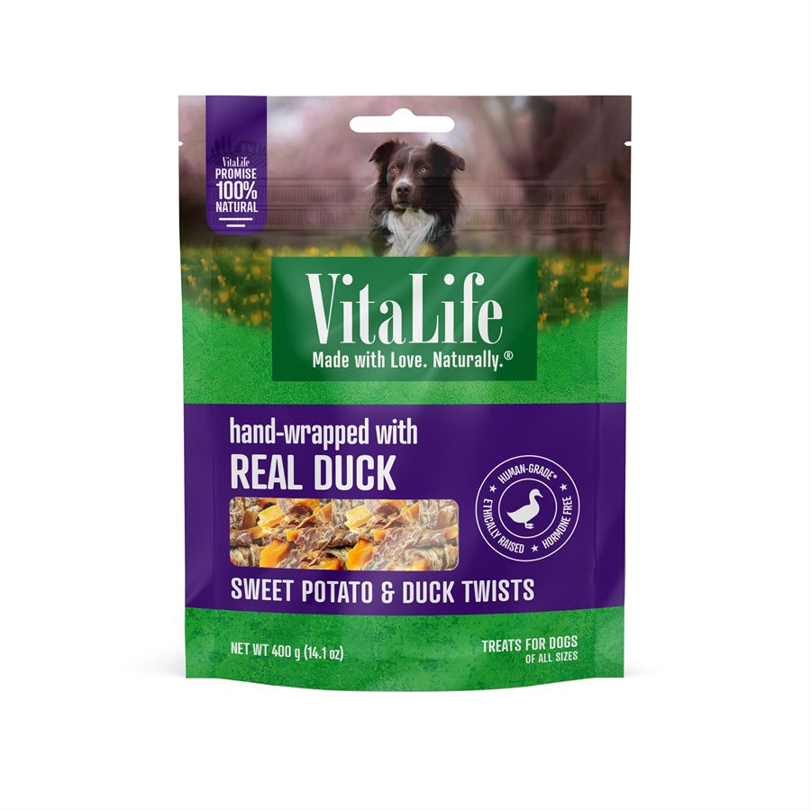 Feed your much-loved furry friends with all natural, premium, healthy and delicious dog treats that taste as good as they sound. VitaLife All Natural Sweet Potato & Duck Twists are hand-crafted with only two, pure and simple ingredients, enticing duck paired with field-grown sweet potato. Delectable, wholesome snacking that helps promote healthy digestion. Your dog is sure to love these treats.